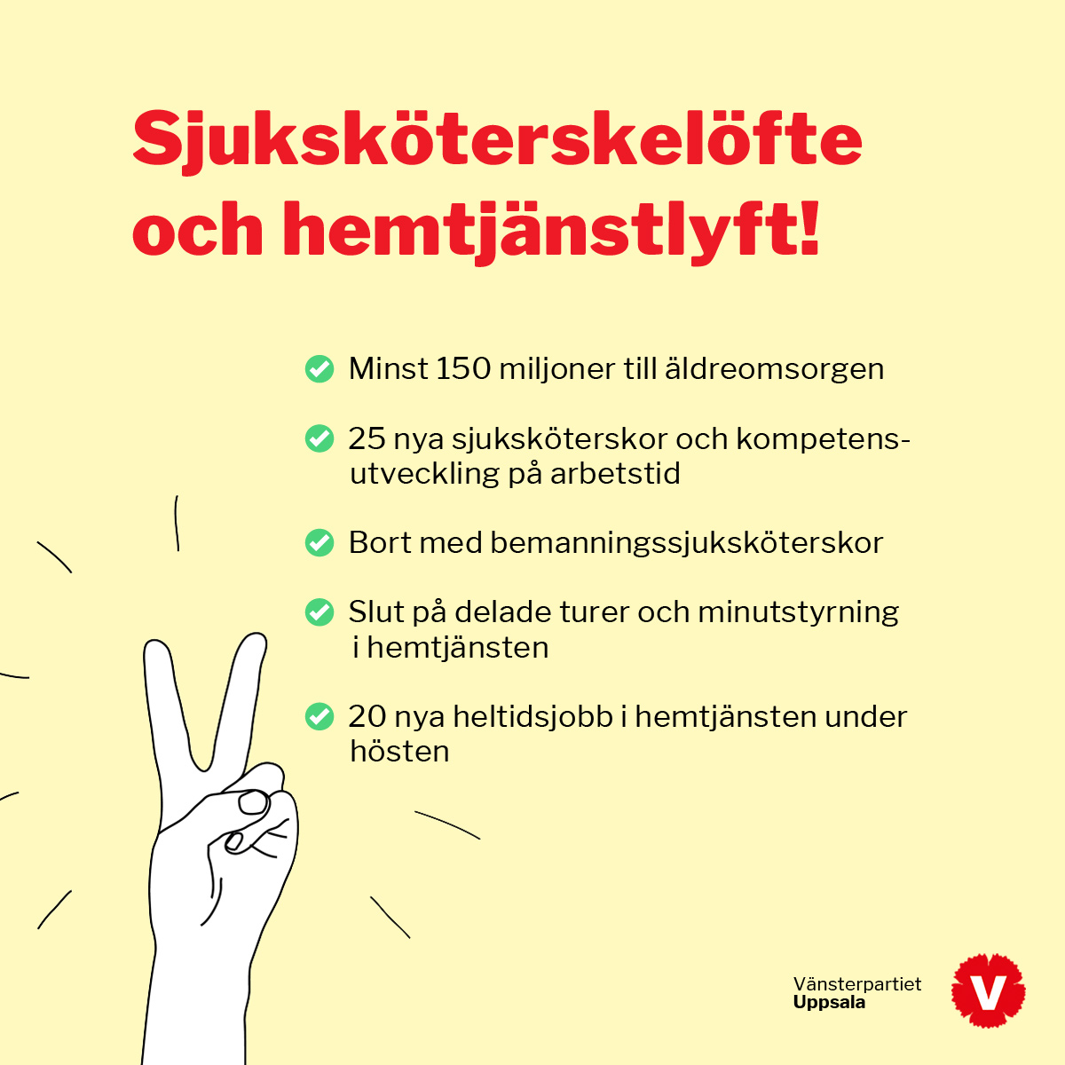 Pandemin har blottat bristerna som Vänsterpartiet länge påtalat i vår äldreomsorg. I riksdagen har vi tack vare Vänsterpartiet kunnat få fram 4,3 miljarder till landets kommuner, utöver regerings satsning på 150 miljoner. Genom att gå ihop med Socialdemokraterna, Liberalerna och Miljöpartiet har Vänsterpartiet kunnat säkerställa att pengarna som kommer Uppsala kommun till del ska gå till att stärka vår äldreomsorg.